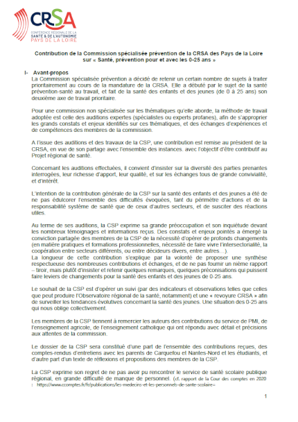 Ce document présente les préconisations de la Commission spécialisée prévention de la CRSA (Conférence régionale de la santé et de l’autonomie en Pays de la Loire), sur la prévention de la santé et des jeunes, issues d’auditions d’experts et acteurs de la région dans le champ de la prévention et de la promotion de la santé.